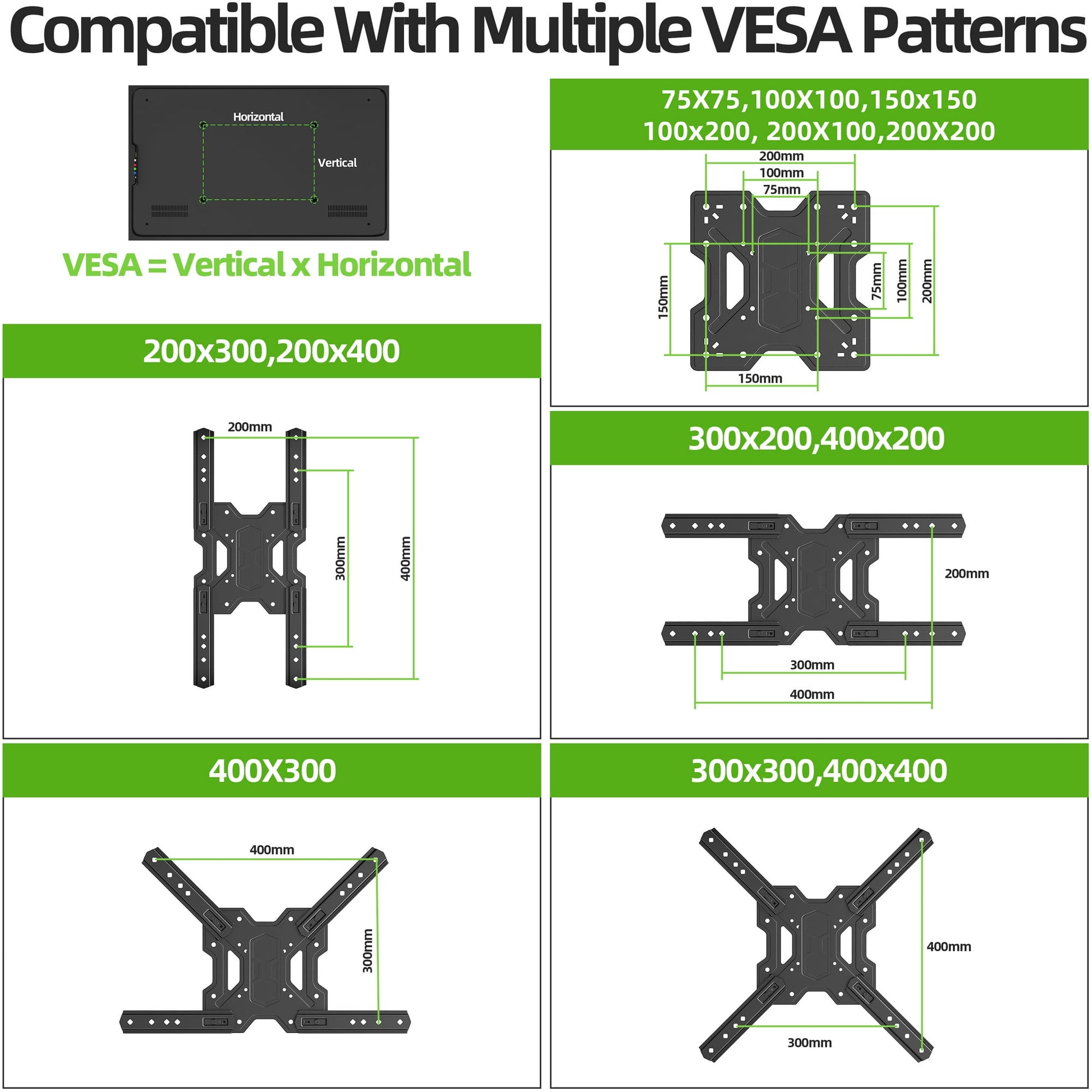 Wide Compatibility: Fits most 23" to 55" flat screen TVs with VESA hole patterns from 75x75mm to 400x400mm.