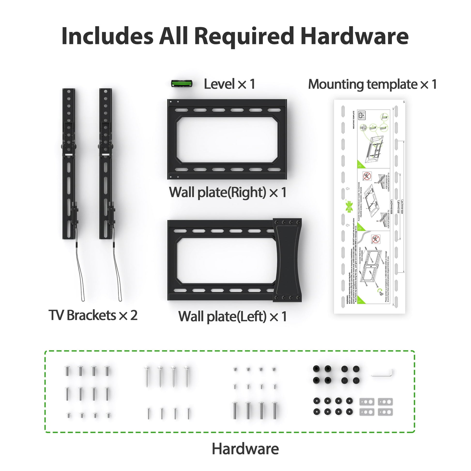 Complete Kit: Includes TV wall mount, mounting hardware, user manual, wall drilling template, and bubble level.