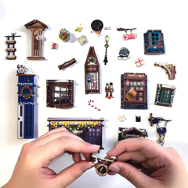 When night falls on the snowy street, golden light spills from every shop window and a gentle carol echoes through the alley. The Moonlight Christmas book nook captures that moment — a magical winter lane inspired by Diagon Alley, where each lamp glows with warmth and the tiny knob lets you turn the scene to life. Piece by piece, you’ll build a little world that feels like Christmas never ends.